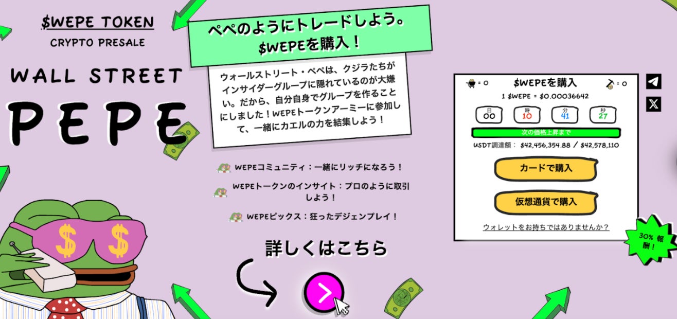 カエルをモチーフとした人気のミームコインPEPEの姉妹ミームコイン「Wall Street Pepe($WEPE、ウォールストリート・ペペ)」がこのほど、資金調達で4000万ドル(63億2000万円)を達成しました。